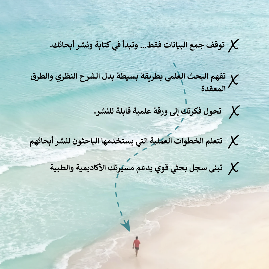 سواء كنت طالب توّك تبدأ أول خطواتك في البحث، أو طبيب تبغى تطوّر مهاراتك وتنشر أبحاثك، إحنا معك خطوة بخطوة. هدفنا إننا نكون سندك عشان تواجه التحديات بكل ثقة وتحقق التميّز اللي انت تستحقه.